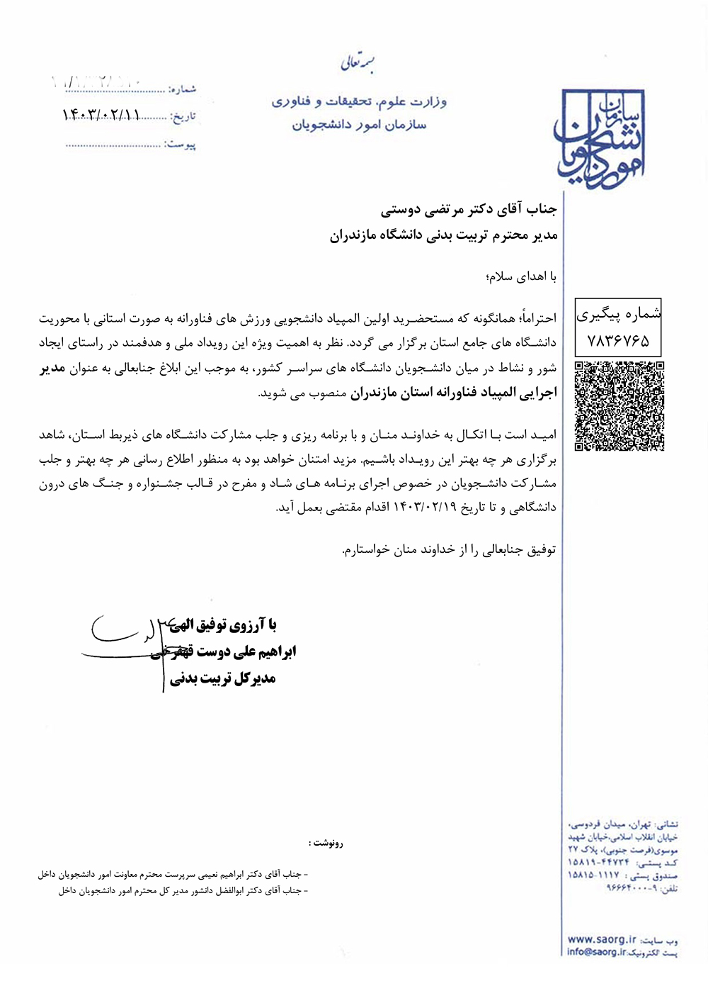 با حکم مدیرکل تربیت بدنی سازمان امور دانشجویان وزارت عتف: